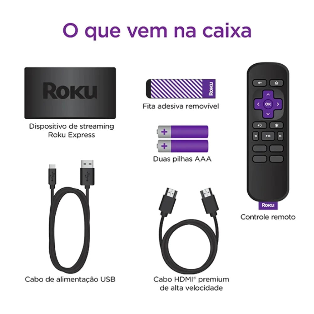 O Roku Express inclui um cabo HDMI® de alta velocidade e um controle remoto fácil de usar. Não há taxa mensal de equipamento nem contratos, e a pesquisa imparcial torna fácil encontrar entretenimento gratuito ou a custo mais baixo.